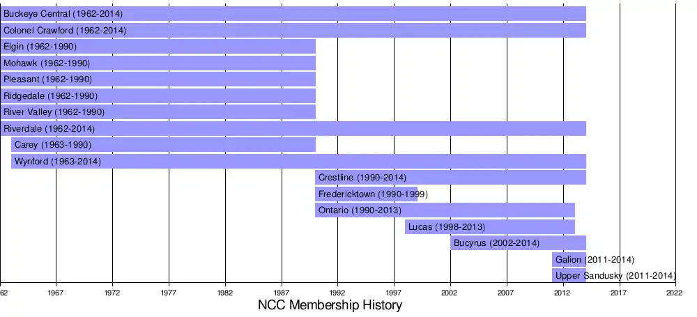 The conference's first year was in the 1962-63 school year. The original members were: Buckeye Central, Colonel Crawford, Elgin, Mohawk, Pleasant, Ridgedale, River Valley and Riverdale. Carey and Wynford joined the NCC for the 1963-64 school year.