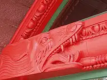 Richardson frequently included Asian stylistic elements, like this carved dragon on a support beam, in his designs