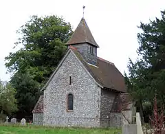 The plan of the Church of St Mary, approached through a farmyard, is simple but unusual in the chancel having an apsidal, or semi-circular termination. The elaborate Norman south doorway in Caen stone suggests a date of the middle of the 12th century.[4] The three Norman windows in the apse have been restored, but the jambs and rere-arches are ancient along with the small Norman window at the west end. The Norman sandstone font was provided an octagonal stem base in the 14th century, and parts of the ancient flint walls were repaired in places with 18th-century brickwork. The single bell dates from 1829.