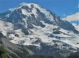 The North Mowich Glacier is a glacier located on the northwest flank of Mount Rainier in Washington. It covers 2.4 square miles (6.2 km2) and contains 9.5 billion ft3 (269 million m3) of ice.[1] Starting from the foot of Rainier's steep Mowich Face at about 9,600 feet (2,900 m), the glacier first consists of two lobes of ice that flow downhill to the northwest. The southern arm of the glacier is connected to the adjacent Edmunds Glacier. As the two sections of ice join up, they form a large, relatively flat plateau of ice ranging from 7,800 feet (2,400 m) to 8,300 feet (2,500 m).[2] This plateau is an unbroken expanse of ice except for Needle Rock, which pokes out of the glacier ice. From then on, the southern part of the glacier terminates at about 6,400 feet (2,000 m), while the northern, rocky arm flows down a glacial valley and ends at about 5,800 ft (1,800 m) in elevation.[2] The North Mowich Glacier gives rise to the North Mowich River.[1]