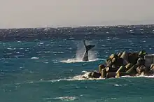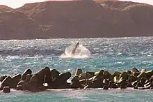 As of 2006, scientists had minimal success satellite tagging North Pacific right whales.[28] Observations total probably less than 50 hours over the last 50 years. What little is known about North Pacific right whale behavior suggests that it is similar to the behavior of right whales in other oceans, except in its choice of wintering grounds. The individual which was observed during a whale-watching tour off the Kii Peninsula, Japan breached six times in a row in 2006.[29] The same whale watching operator had two sightings in 2006 and again had a very close encounter with a right whale in 2011. This animal was very curious and active; it swam around the vessel for more than 2 hours, breaching, spyhopping, tail-slapping, and pec-slapping close to the boat. The ship had to cruise away from the whale because it kept following them. Another curious and playful individual was encountered during a whale-watching trip off Bonin Islands in March 2014.[30]