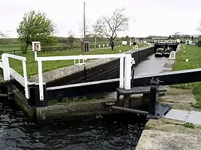 The ring now follows an active commercial waterway, where narrowboats may meet 600-tonne oil tankers and sand barges. Most of the locks on the River Aire section from Leeds to Castleford Junction are 200 by 20 feet (61.0 by 6.1 m), while those on the River Calder section from Castleford to Wakefield are 141 by 17.75 feet (42.98 by 5.41 m).[14] The ring does not include the navigation below Castleford, where locks were 457 feet (139 m) long, to allow them to be used by a tug and 19 Tom Pudding compartment boats.[15]