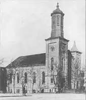 The new church, one of the first houses of worship in upper Manhattan, was dedicated later that year.[5]: 70 [11]: 290 The building, Romanesque in style, was 85 feet long and 48 feet wide, with two brick towers, one a clock tower 120 feet high topped by a belfry enclosing a 1500-pound bell. The capacity was 600, with 88 pews of varied lengths. The sanctuary was 72 feet by 46 feet with a gallery over the vestibule. The ceilings and upper walls were frescoed, the trim was oak, and the windows were stained glass.[4]