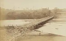 In the 1860s a wooden bridge was built across the Hawkesbury River to provide an easier crossing than the ferry or punt which had been used. In 1905 it was replaced by a higher-level bridge which was the largest reinforced concrete bridge to be constructed. It remained so for 20 years. In 1926 a railway branch line between Richmond and Kurrajong was opened. The railway bridge was built right next to the concrete bridge. The line curved to the right at the western end of the bridge before curving back around to cross Bells Line of Road at an angle near the intersection with Grose Vale Road. North Richmond had a railway station. When the line closed in 1952, the railway bridge became part of the roadway.