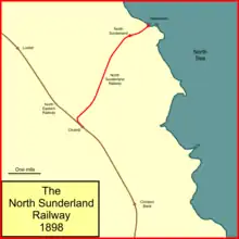 The North Sunderland Railway was a railway line in Northumberland, England. It was opened in 1898, and ran from Chathill to Seahouses, with an intermediate station at North Sunderland. Chathill was on the main line of the North Eastern Railway between Morpeth and Berwick. The branch was four miles in length and a single track with standard gauge track.