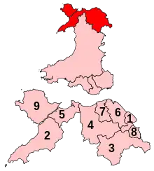 | Constituencies 1. Aberconwy 2. Alyn and Deeside 3. Arfon 4. Clwyd South 5. Clwyd West 6. Delyn 7. Vale of Clwyd 8. Wrexham 9. Ynys Môn | |