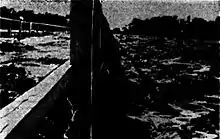 The flooded Gascoyne River in Carnarvon, 1942, with water rushing over the deck of the bridge. During such floods, roads could become bogs or be completely washed away.