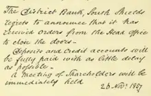 The District Bank, South Shields regrets to announce that it has received orders from the Head Office to close the doors. Deposits and credits accounts will be fully paid with as little delay as possible. A meeting of shareholders will be immediately held.