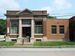 The banking industry in Davenport enjoyed significant growth from around 1900 to 1915. The new buildings that were built by them in this era expressed this growth both downtown and in the newly established neighborhood branch banks.[4] For the most part, they were built in some version of the Neoclassical style. This small bank building is a relatively simple single-story brick structure. It is built on a concrete block foundation. The building features engaged columns in the Doric order that support a full entablature and triangular pediment, and pilasters that are topped with egg-and-dart molding on the classically detailed caps. The main entrance has been partially filled in to create a smaller doorway. A small addition was also added to the south side of the building at a later date.