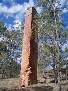 One chimney remains upslope of the furnaces, to 10 metres (33 ft) height. Downslope of the furnaces is a brick paved area, with water tanks and machinery footings stepping down the slope from it. Close to the creek are footings and base-logs that may have been the footings for a water pump.[1]