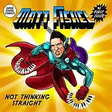 The artwork for Not Thinking Straight was created by San Diego comic book artist and illustrator Joe Phillips.[5] The album cover depicts Fishel as a superhero in cartoon form, with a guitar on his back and piano keys around his hands. The words 'Super Fishel Comics' and '#1 First Issue' are also written on the cover. The CD version of the album comes with a sixteen-page colour booklet[4] and the iTunes release comes with a digital eighteen-page colour booklet,[2] each containing full artwork, lyrics, credits and thank yous. Both versions of the album booklet are presented in a comic book format. Each contains eighteen original illustrations by Phillips, with each illustration representing a different song's lyrics and showing images of young gay life and relationships.[5][9]