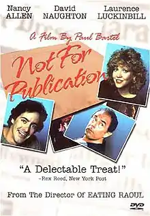 Not for Publication is a 1984 screwball comedy film directed by Paul Bartel and starring Nancy Allen, David Naughton, Laurence Luckinbill, Alan Rosenberg, and Alice Ghostley.[3] The film premiered on November 1, 1984 and was also screened at the 1985 Sundance Film Festival, where it was acquired for distribution by Thorn EMI Screen Entertainment.[4]