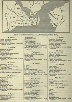 Map of the regions of the city according to the Notitia, including the major buildings present in each of them.