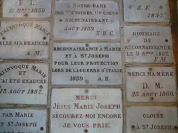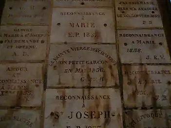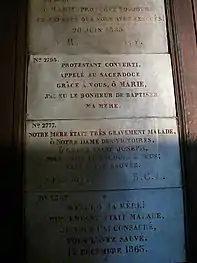 Notre-Dame-des-Victoires is unique among Paris churches in its display of ex-voto offering left their by faithful parishioners, thanking the Virgin Mary for blessings they have received. It currently displays over thirty-seven thousand devotional plaques which cover most of the walls, as well as silver and gold hearts and military decorations.[2] Over 37,000 devotional plaques, silver and gold hearts, as well The basilica once served as a stational church along the pilgrimage route to Compostela. As such, many of the ex voto offerings were left by faithful unable to make the long journey to the Shrine of Compostela itself.
