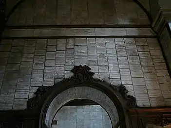 The long nave is lined with columns creating an arcade with rounded arches. It is inspired by the Church of the Jesu in Rome, bringing the congregation in the nave closer to the altar. The choir, where the clergy are seated, occupies a third of the church, and features finely-carved stalls from the 17th century along both sides. The interior decoration combines elements of the classical style, including cornices decorated with sculpted roses and columns with capitals of the Ionic order, with sculptural decoration in the Baroque style; garlands of flowers, seashells and cherubs.[16]