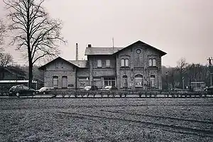 The station building was built of yellow bricks in 1870 together with the rest of the station. The station restaurant was closed in 1970 and the ticket office was closed 1975. The municipality of Nottuln acquired the heritage-listed entrance building in 1999. All attempts to sell the building, including over eBay, were unsuccessful.[5] On 18 January 2007, the roof of the station building was so badly damaged by extratropical cyclone Kyrill that it had to be demolished in April 2007 for safety reasons.