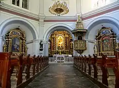 Nova Štifta is best known for its pilgrimage church dedicated to the Assumption of Mary. It is a Baroque church with an exterior arcade. It was built between 1641 and 1671[4] and was commissioned by the Jurij Khisl, lord of the castle in Ribnica, after a mysterious light appeared at Juniper Hill (Brinov vrh, 622 meters or 2,041 feet), as the site is known. The church has an octagonal nave and a smaller square chancel with beveled corners. The cupola rises 27 meters (89 ft) and is topped by a belfry with a Baroque roof. The church is probably based on the Renaissance Coronation of the Virgin Church in Lodi, Italy, which was a model for many later churches in Slovenia.[5]