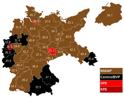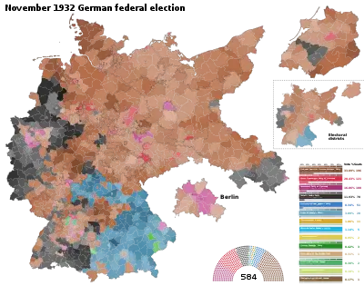 Federal elections were held in Germany on 6 November 1932.[1] The Nazi Party saw its vote share fall by four percentage points, while there were slight increases for the Communist Party of Germany and the national conservative German National People's Party. The results were a great disappointment for the Nazis, who lost 34 seats and again failed to form a coalition government in the Reichstag. The elections were the last free and fair all-German election before the Nazi seizure of power in 1933.