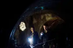 Aaron insists upon accompanying Maggie, and shows her a sewer that takes them under the wall and bypasses the walkers surrounding it. After fending off walkers in the sewer, they reach the exit, only to discover that the back end of the herd is right outside. Despondent, Maggie admits defeat and tearfully reveals to Aaron that she is pregnant.