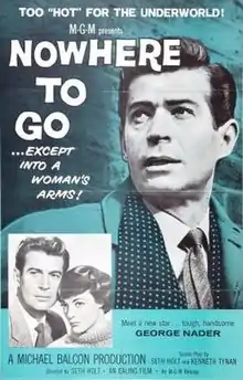 Nowhere to Go is a 1958 British crime film directed by Seth Holt in his directorial debut. It stars George Nader, Maggie Smith (receiving her first screen credit), Bernard Lee, Harry H. Corbett and Bessie Love.[4] A criminal escapes from jail and attempts to recover his stashed loot but is shunned by the criminal community and hunted by the police.