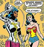 Nubia is a fictional character appearing in DC Comics publications and related media, commonly as an ally of Wonder Woman. Historically, she is DC Comics' first black female superhero. Originally introduced in 1973 as Wonder Woman's long-lost fraternal twin, today the character is depicted as one of Wonder Woman's oldest and closest friends. Created by Robert Kanigher and Don Heck, Nubia debuted in 1973's Wonder Woman #204 and appeared intermittently throughout Wonder Woman's Bronze Age adventures.[1]