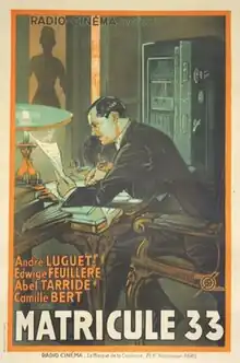 Number 33 (French: Matricule 33) is a 1933 French spy drama film directed by Karl Anton and starring André Luguet, Edwige Feuillère and Abel Tarride.[1] [2] The film's sets were designed by the art director Henri Menessier.