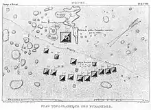 Pyramids of Nuri in 1821 (plan). The largest one (Nb. 1) belongs to Taharqa, the others are numbered from West to East.