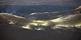 In 2014, a new lava lake appeared at the volcano for the first time in 75 years. The previous lava lake at the volcano was emptied in the 1938 lava flow. The formation of the new lake occurred between June and August 2014.[9] It reached a depth of 500 metres (1,600 ft). The eruption did not affect the communities in the area but left a lot of ash and air pollution. Sulfate aerosols formed by volcanic sulfur dioxide from the eruptions were observed as far away as over the central Amazon rain forest in South America.[10] By 2018, the lava lake had hardened and the activity appeared to have stopped. Eruptive activity continues during 2021 at the summit caldera. [11]