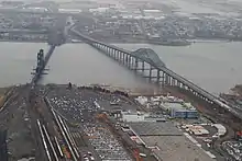 The Upper Bay Bridge for trains and the Newark Bay Bridge for vehicles cross Newark Bay east of Oak Island Yard