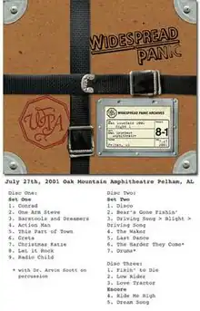 The Widespread Panic Archives are planning to re-master yet another 2001 performance from Oak Mountain Amphitheatre for its next multi-track release project. The live album, Oak Mountain 2001 – Night 2, was originally recorded on July 28, 2001. That album will be the second night of Widespread Panic's three-night run at the Oak Mountain Amphitheatre in 2001 to be released as a multi-track recording by the Widespread Panic Archives.[1]