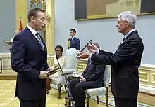 Then-leader of the Conservative Party of Canada, Andrew Scheer, is sworn into the Queen's Privy Council by Clerk of the Privy Council Michael Wernick, in front of Governor General David Johnston, at Rideau Hall, 25 September 2017
