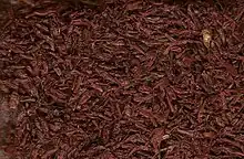 Various insects are consumed in the state including ants and grubs from maguey plants but the best known of these is grasshoppers, called chapulines.[13] Although eaten in other parts of Mexico, chapulines are most popular in the Central Valleys area of Oaxaca. They are an important source of protein in the rural areas and a delicacy in the city of Oaxaca. They have been eaten since well before the arrival of the Spanish and are generally eaten as a condiment, snack food and sometimes the main dish.[10] Their preparation and sale is a full-time occupation for many and an important source of income for many rural families. They are even shipped to the United States.[10]