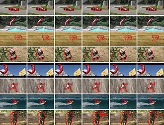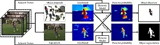 In action localization applications, object co-segmentation is also implemented as the segment-tube spatio-temporal detector.[7] Inspired by the recent spatio-temporal action localization efforts with tubelets (sequences of bounding boxes), Le et al. present a new spatio-temporal action localization detector Segment-tube, which consists of sequences of per-frame segmentation masks. This Segment-tube detector can temporally pinpoint the starting/ending frame of each action category in the presence of preceding/subsequent interference actions in untrimmed videos. Simultaneously, the Segment-tube detector produces per-frame segmentation masks instead of bounding boxes, offering superior spatial accuracy to tubelets. This is achieved by alternating iterative optimization between temporal action localization and spatial action segmentation.