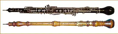 The oboe d'amore (Italian for 'love oboe'; (pronounced [ˈɔːboe daˈmoːre]), less commonly hautbois d'amour (French: [obwɑ damuʁ]), is a double reed woodwind musical instrument in the oboe family.[1] Slightly larger than the oboe, it has a less assertive and a more tranquil and serene tone, and is considered the mezzo-soprano of the oboe family, between the oboe (soprano) and the cor anglais or English horn (alto).[2] It is a transposing instrument, sounding a minor third lower than it is notated, i.e. in A. The bell (called Liebesfuß) is pear-shaped and the instrument uses a bocal, similar to but shorter than that of the cor anglais.