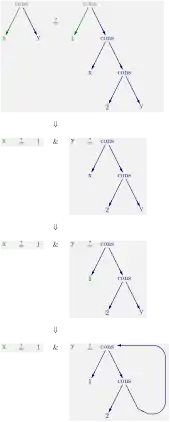 See image for an example run of the unification algorithm given in Unification (computer science)#A unification algorithm, trying to solve the goal , however without the occurs check rule (named "check" there); applying rule "eliminate" instead leads to a cyclic graph (i.e. an infinite term) in the last step.