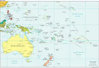 The United Nations (UN) has used its own geopolitical definition of Oceania since its foundation in 1947, which utilizes four of the five subregions from the 19th century; Australasia, Melanesia, Micronesia, and Polynesia. This definition consists of discrete political entities, and so excludes the Bonin Islands, Hawaii, Clipperton Island and the Juan Fernández Islands, along with Easter Island — which was annexed by Chile in 1888.[67] It is used in statistical reports, by the International Olympic Committee, and by many atlases.[68] The UN categorizes Oceania, and by extension the Pacific area, as one of the major continental divisions of the world, along with Africa, Asia, Europe and the Americas. Their definition includes American Samoa, Australia and their external territories, the Cook Islands, Federated States of Micronesia, French Polynesia, Fiji, Guam, Kiribati, the Marshall Islands, Nauru, New Caledonia, New Zealand, Niue, the Northern Mariana Islands, Palau, Papua New Guinea, Pitcairn Islands, Samoa, the Solomon Islands, Tokelau, Tonga, Tuvalu, Vanuatu, Wallis and Futuna, and the United States Minor Outlying Islands (Baker Island, Howland Island, Jarvis Island, Midway Atoll, Palmyra Atoll, and Wake Island).[67] The original UN definition of Oceania from 1947 included these same countries and semi-independent territories, which were mostly still colonies at that point.[69] Hawaii had not yet become a U.S. state in 1947, and as such was part of the original UN definition of Oceania. The island states of Indonesia, Japan, the Philippines, Singapore and Taiwan, all located within the bounds of the Pacific or associated marginal seas, are excluded from the UN definition. The states of Hong Kong and Malaysia, located in both mainland Asia and marginal seas of the Pacific, are also excluded, as is the nation of Brunei, which shares the island of Borneo with Indonesia and Malaysia. Further excluded are East Timor and Indonesian New Guinea/Western New Guinea, areas which are biogeographically or geologically associated with the Australian landmass.[70][71] The CIA World Factbook also categorizes Oceania as one of the major continental divisions of the world, but the name "Australia and Oceania" is used. Their definition does not include all of Australia's external territories, but is otherwise the same as the UN's definition, and is also used for statistical purposes.[72] In a 2008 article for the India Quarterly journal titled Oceania and Security: A Perspective from New Zealand, author Peter Cozens stated, "the region of Oceania is characterised by vast distances across the sea between continental land masses [...] It is difficult to be precise about the term Oceania and its exact delimitation", adding that "the principal regional political grouping is contained within the Pacific Island Forum (PIF) - the 16 states making up the Forum are: Australia, Cook Islands, Federated States of Micronesia, Fiji, Kiribati, Marshall Islands, Nauru, New Zealand, Niue, Palau, Papua New Guinea, Samoa, Solomon Islands, Tonga, Tuvalu and Vanuatu - in general terms this is the area referred to as Oceania by the United Nations and similar agencies."[73] The Pacific Islands Forum expanded during the early 2010s, and areas that were already included in the UN definition of Oceania, such as French Polynesia, gained membership.[74]