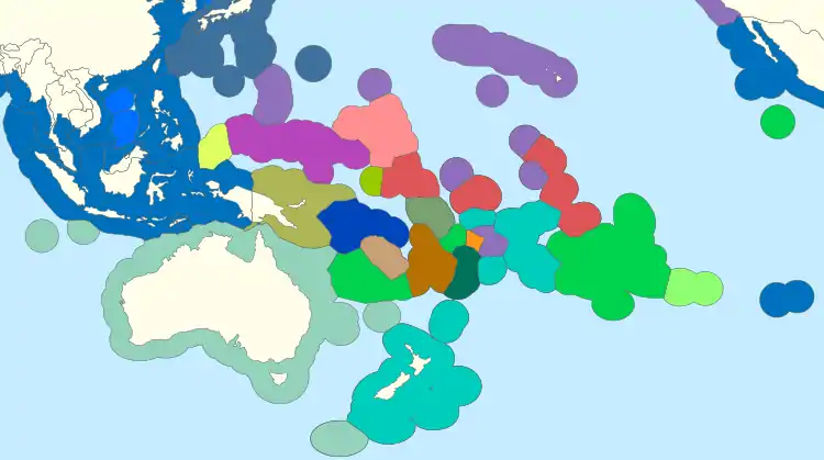Depending on the definition, New Zealand could be part of Polynesia, or part of Australasia with Australia.[157] New Zealand was originally settled by the Polynesian Māori, and has long maintained a political influence over the subregion.[158][159] Through immigration and high Māori birth rates, New Zealand has attained the largest population of Polynesians in the world,[160] while Australia has the third largest Polynesian population (consisting entirely of immigrants). Modern-day Indigenous Australians are loosely related to Melanesians,[161][162] and Australia maintains political influence over Melanesia,[159] which is mostly located on the same tectonic plate.[56][57] Despite this, Australia is rarely seen as a part of the subregion.[163][164] As with Australia and New Zealand, Melanesia's New Caledonia has a significant non-indigenous European population, numbering around 71,000.[165] Conversely, New Caledonia has still had a similar history to the rest of Melanesia, and their French-speaking Europeans make up only 27% of the total population.[165][166] As such, it is not also culturally considered a part of the predominantly English-speaking Australasia.[167] Some cultural and political definitions of Australasia include most or all of Melanesia, due to its geographical proximity to Australia and New Zealand, but these are rare.[168] Australia, New Zealand and the islands of Melanesia are more commonly grouped together as part of the Australasian biogeographical realm.[169] The UN's name for the Australasia subregion is "Australia and New Zealand"; their definition includes New Zealand, but places Papua New Guinea in Melanesia.[67] Papua New Guinea is geographically the closest country to Australia, and is often geologically associated with Australia as it was once physiologically connected.[67] The UN's definition of this subregion also includes Australia's Indian Ocean external territories of Christmas Island and Cocos (Keeling) Islands.[67] These tropical islands are situated within the bounds of the Australian Plate and have been geographically associated with Southeast Asia, due to their proximity to western Indonesia.[170][171][172][173][174] Both were uninhabited when discovered by Europeans during the 17th century. Approximately half of the population on these islands are European Australian mainlanders (with smaller numbers being European New Zealanders), while the other half are immigrants from China or the nearby Malay Archipelago.[175][176] The UN further define the subregion as including Australia's Indian Ocean external territory Heard Island and McDonald Islands. These islands lie on the Antarctic Plate and are also thought of as being in Antarctica or no region at all, due to their extreme geographical isolation.[177][67] The World Factbook define Heard Island and McDonald Islands as part of Antarctica, while placing Christmas Island and Cocos (Keeling) Islands as the westernmost extent of Oceania.[178][179]