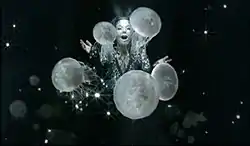 The accompanying music video for "Oceania" was directed by Lynn Fox, and was premiered on August 13, 2004 through Björk's official site.[21] According to Lynn Fox, Björk gave the team the initial sketch of the track in January 2004. Whilst they were doing scribbles for it, they had several phone conversations with the singer and emailed her images to keep her up to date with the progress of the work. For "Oceania", initial animations took six weeks, then had couple of days preparing for the shoot in Iceland and a few more days after to put all the shots together.[22] Björk's make-up took eight hours to be done and included a hand-collage of tiny crystal gems on her face. Post-production team The Mill was then hired to emphasise the glints that beam from them. Initially, a Flame spark was used to select and highlight glints automatically but the results proved "too random". For a more "organic" look, The Mill's Paul Marangos spent two days in Flame inputting glints by hand, using live action glints as reference. The Mill's Adam Scott further enhanced the video with an initial live action grade and final DCP. The video was finished just a day before the opening ceremony, leaving a small amount to get the video distributed to TV stations. BEAM.TV distributed the video instantly via its network of international post-production partners.[23]