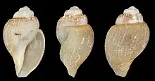 (Original description) The whitish shell is short, stout, with rather coarse sculpture and very short spire. It contains about five whorls, the body whorl much the largest . The whorls are inflated. The suture is deep, almost channeled. The sculpture consists of numerous (on the body whorl about two to the millimeter) narrow, backwardly convex, tlexuous riblets with about equal interspaces, strongest near the suture, not crossing the fasciole and obsolete near the periphery. The lines of growth are distinct, crossed by numerous (about six to the millimeter) rather coarse threads, of which each alternate one tends to be smaller, separated by narrow grooves and about uniformly distributed over the surface, with a tendency to a faint carina in front of the indistinct fasciole. The outer lip is sharp. The simple columella is white. The aperture is pinkish. The short siphonal canal is wide. The whorls of the protoconch are eroded in the specimens. The operculum has a light horn color. It is rather broad and short. The soft parts are pink.[2]