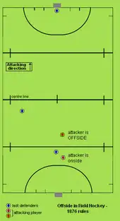 A set of rules of field hockey was drawn up by several clubs in London in January 1876 following the establishment of the first, briefly existing, Hockey Association (of England) the year before. (The second, and final, Hockey Association was formed in 1886.) An offside rule was included in the 1876 rules. Under this rule, a player who was nearer to the opponent team's goal-line than both the ball and the third to last opponent was said to be at an offside position (simply put: an attacking player was offside if the ball was behind them and there were fewer than three defenders between them and the goal they were attacking). The rule was applied on the whole pitch, except when the ball was hit from the goal-line.