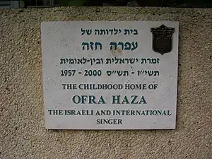 Bat-Sheva Ofra Haza was born in Tel Aviv, Israel,[9] to Mizrahi Jewish parents from Yemen who had immigrated to Israel in 1949[10] with eight children.[11][8][12] She was the youngest of nine children[13] (six sisters and two brothers) to Yefet and Shoshana Haza. They were raised in a Masorti household[14] in the Hatikva Quarter, then an impoverished, working-class[7] neighborhood of Tel Aviv.[12][15][13] Although named Bat-Sheva by her parents, her sisters disliked the name, and preferred to call her by her middle name, Ofra, instead.