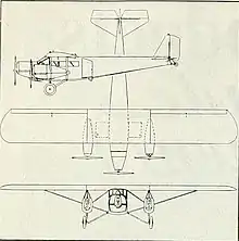The trimotor Osprey was a monoplane with a high, three-part wing of rectangular plan out to blunted tips. Its centre section contained two 45 US gal (37 imp gal; 170 L) fuel tanks and extended as far as the outer engines. The trailing edges of the outer panels were filled with narrow chord ailerons. The wing was built around twin spruce box spars with spruce ribs and was fabric covered, though its leading edges were spruce plywood. The outer panels were braced from the lower fuselage longerons by parallel pairs of struts to the spars which ran through the outer engine mountings. The engines were further braced with central struts to the upper longerons.[1][2]