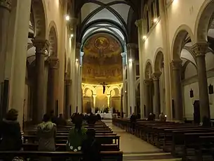 The central nave ends, beyond the transept, with the semicircular apse, crowned by an ambulatory that houses the pipe organ, built in 1965 by the Pinchi company (it has an electric transmission with multiple system, 18 stops on two manuals and a pedalboard);[12] the upper part is decorated with a mosaic depicting the Trinity, Mary Immaculate and All Saints by Silvio Galimberti (1920).[11]