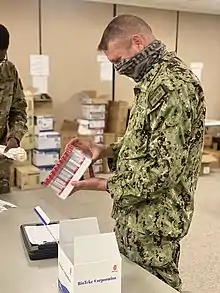 A member of the Ohio Naval Militia inventories Covid-19 testing kits.