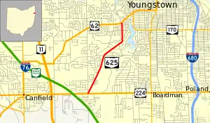 State Route 625 (SR 625) is a state route in northeastern Ohio that exists entirely within Mahoning County. The southern terminus of SR 625 is at U.S. Route 224 (US 224) near Boardman, and its northern terminus is at US 62 in the southwestern portion of Youngstown. SR 625 is currently signed north–south, but in the past was signed eastwest.