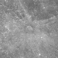 This crater is located at the origin of an extensive ray system that extends for several hundred kilometers across the surrounding lunar terrain. The exterior surface for about 20–30 km is relatively free of the ray material, but beyond that perimeter is a skirt of higher albedo, with streaks extending to the northwest, east-northeast, and southwards. The crater is part of the Copernican System.[1]