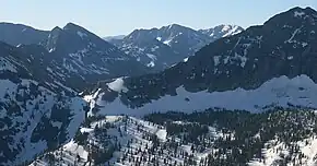 Ojibway Peak is located 22 miles (35 km) south of Libby, Montana, in the Cabinet Mountains Wilderness, on land managed by Kaniksu National Forest and Kootenai National Forest.[2] It is set west of the Continental Divide in the Cabinet Mountains which are a subrange of the Rocky Mountains.[1] Precipitation runoff from the mountain's east slope drains into Libby Creek which is a tributary of the Kootenai River, whereas the west slope drains into Rock Creek which is a tributary of the Clark Fork River. Topographic relief is significant as the summit rises over 3,300 feet (1,000 m) above Rock Creek in one mile (1.6 km) and 2,345 feet (715 m) above Rock Lake in 0.6 mile (1 km). The mountain's toponym was officially adopted in 1923 by the U.S. Board on Geographic Names and the name is a Native American word.[3][4]