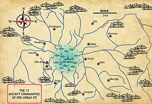 Map showing the relative positions of the Thirteen ancient communities or clans present in the area of ancient Ife pre unification.