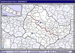 Okhaldhunga District (Nepali: ओखलढुङ्गा जिल्लाListen) is one of the fourteen districts of Koshi Province in eastern Nepal. The district, with the municipality of Okhaldhunga as its district headquarters, covers an area of 1,074.5 km2 (414.9 sq mi) and had a population of 156,702 in 2001 and 147,984 in 2011.[2]