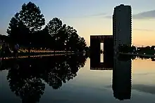 • Reflecting Pool: a thin layer of water flows over polished black granite to form the pool, which runs east to west down the center of the Memorial (also see reflecting pool) on what was once Fifth Street. Although the pool is flowing, visitors are able to see a mirror image of themselves in the water. Visitors seeing their reflections are said to be seeing "someone changed forever by what happened here."[1][6]